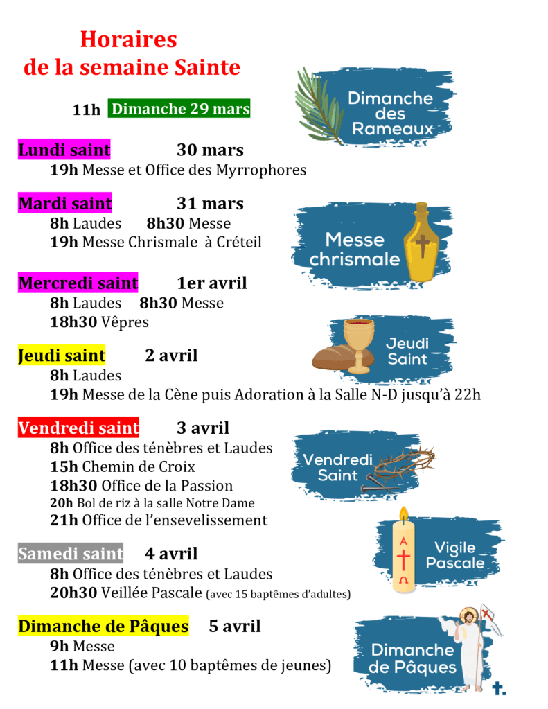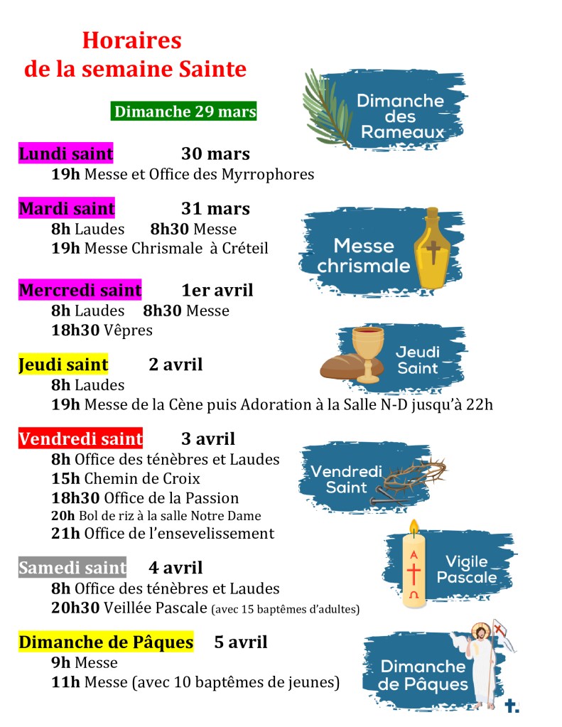 – Prière : lire un livre spirituel ou 1 chapitre de l’Evangile/jour, prier le chapelet, aller à la messe en semaine (en plus du dimanche), aller à l’adoration le samedi matin, au Chemin de Croix le vendredi à 15h… réciter en plus tous les jours une prière nouvelle, etc…. Saint Carême à tous !!!